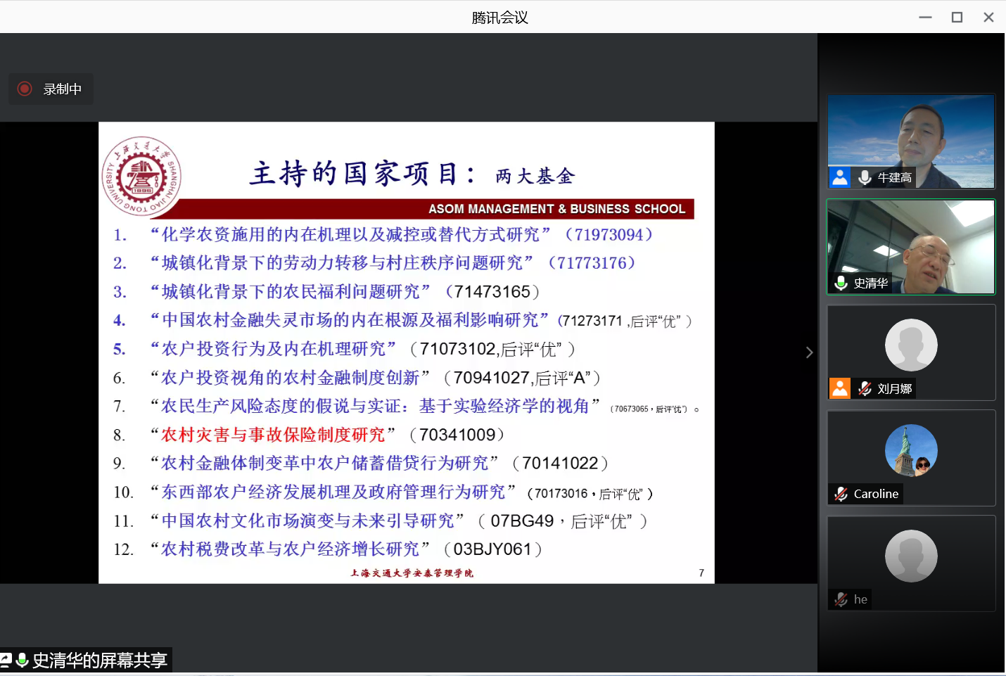 1月14日,国务院特殊津贴获得者、上海交通大学特聘教授、博士生导师史清华博士应经济学院邀请,在线为BB贝博教师作题为“论文选题与项目申报:我的故事”专题报告。经济学院院长牛建高主持报告会,经济学院全体老师及部分单位教师共计160余人在线聆听了报告。