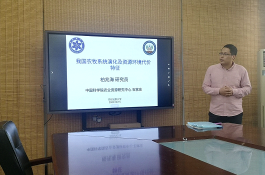 柏兆海研究员介绍了我国农牧系统演化及资源环境代价的特征、利用农牧系统绿色发展和可持续发展多指标评价体系,定量的描述了过去几十年中国畜牧业转型的变化趋势,揭示了该转型的驱动因素、资源环境效应,并讨论和设计我国未来农牧系统绿色发展的路径。最后提出了希望和数学专业教师合作的方向及问题。报告后,数理教学部师生与柏兆海研究员就报告内容、合作方向及问题进行了深入探讨,大家都希望能进一步合作,建立长期合作的机制。