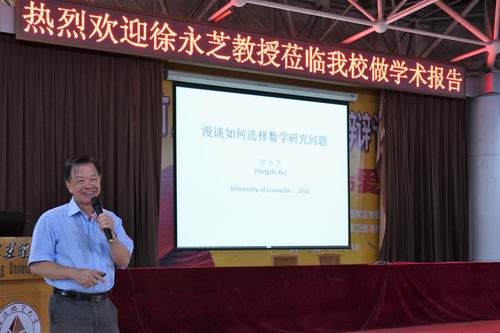 5月4日下午,应数理学院邀请,美国路易斯维尔大学徐永芝教授在科技报告厅为广大师生作了题为“如何选择数学研究问题及反问题相关进展”的学术讲座。报告由数理学院院长段生贵主持,科技处于开宁副处长、数学地质专家张生元教授、数理学院副院长曹南斌以及学校相关专业的200余名师生听取讲座。