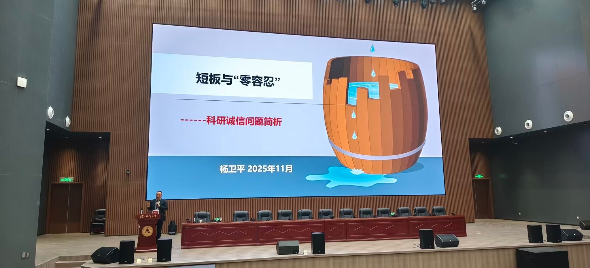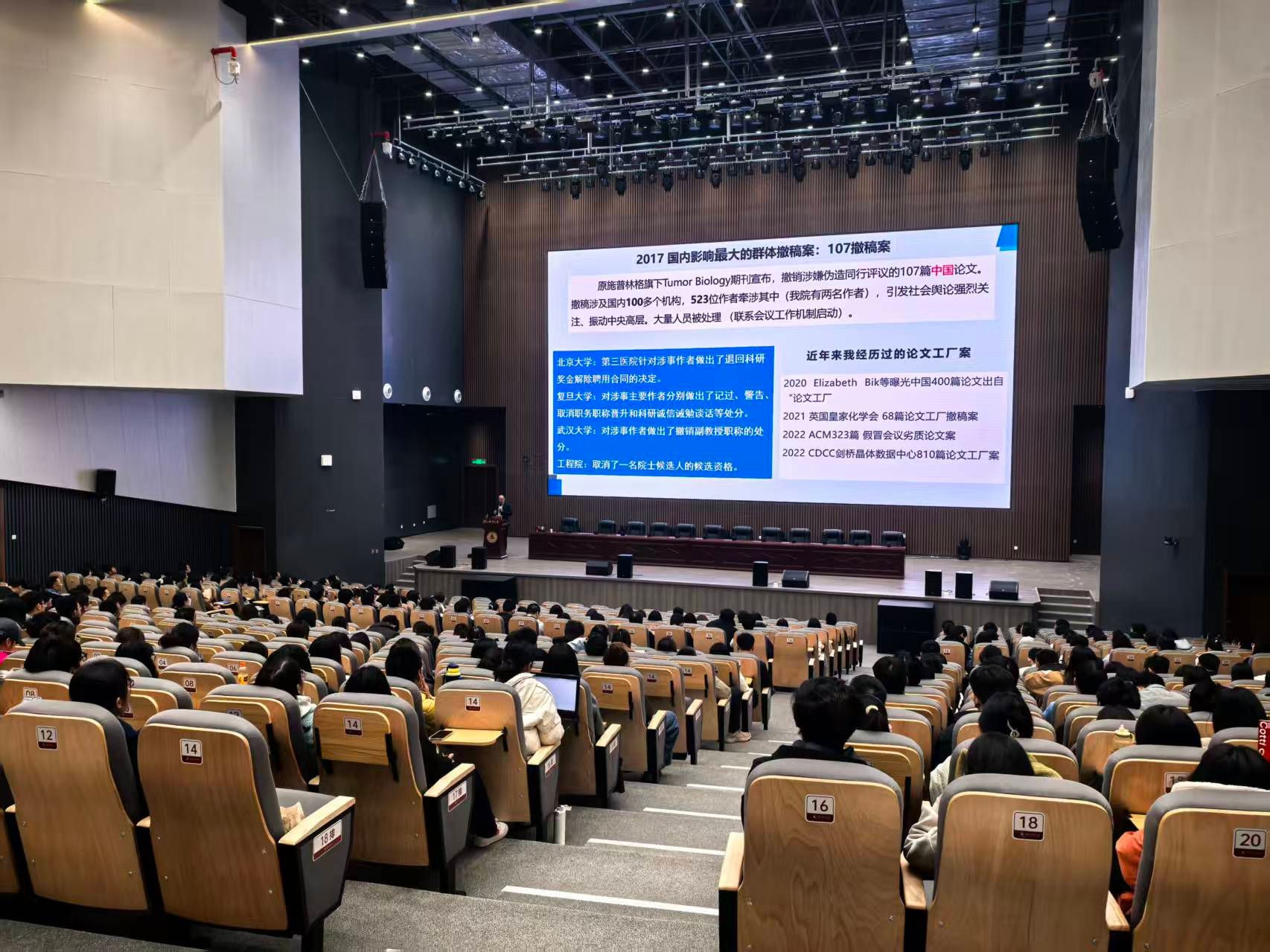 杨卫平以“短板与零容忍:科研诚信问题解析”为题,从习近平同志《论科技自立自强》讲起,阐述了对学术不端行为“零容忍”的政策背景,指出“科研诚信是科技创新的基石,科研诚信滑坡是建成社会主义现代化强国的最大短板”,强调了加强科研诚信建设和学风建设的紧迫性和重要性。