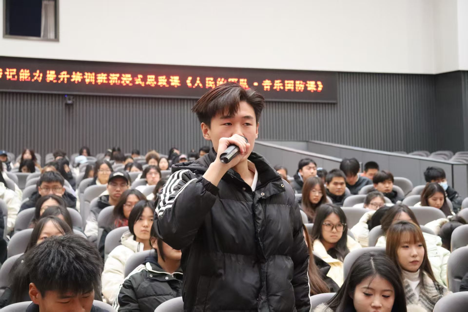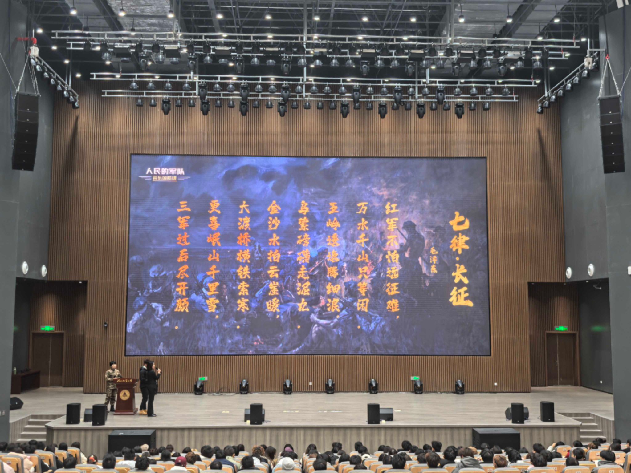 “强国必须强军,军强才能国安。”国防教育是青年成长成才的重要一课。讲座现场,主讲人创新融合现场讲述、诗词吟诵、红色音乐、经典影视等多元形式,紧扣“我们的军队是人民军队,我们的国防是全民国防”核心要义,将习近平强军思想、爱国主义教育融入生动叙事,引导学子在沉浸式体验中感悟国防建设的深远意义,有效激发了大家爱国拥军的青春热忱。讲座还特别穿插了红色诗词诵读环节,两校学生代表联袂朗诵《七律・长征》,让历史上那段波澜壮阔的峥嵘岁月、革命先辈们不屈不挠的奋斗精神跃然眼前。互动采访阶段,围绕“我为国防做什么”核心议题,学子们以坚定表态诠释了对历史的敬畏和对家国责任的担当,大家积极交流国防建设的思考与实践设想,话语间尽显赤诚家国情怀。活动最后,全体师生齐声合唱《歌唱祖国》,深情的旋律与动容的神情,将现场的爱国情怀与国防教育氛围推向高潮。