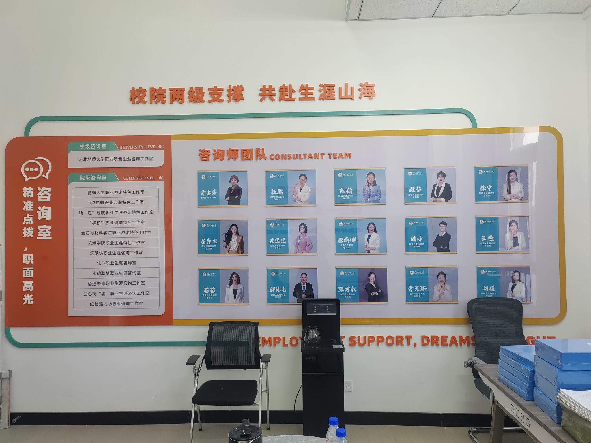 建设中,各学院充分发挥主体性与创造性,打造出一批定位清晰、特色鲜明、深受学生欢迎的工作室品牌。例如:地球科学学院“地‘途’导航工作室”创新“科研反哺生涯”模式;管理学院“管理人生工作室”注重“心职融合”;宝石与材料学院工作室搭建“校企生”三方联动平台;经济学院“筑梦坊工作室”运用科技手段模拟岗位实战;法政学院“枫桥”工作室提供“多对一”联合咨询;艺术学院将生涯指导嵌入专业实践全程;土地科学与空间规划学院“北斗咨询室”构建全过程陪伴体系;水资源与环境学院“水韵职梦咨询室”推动专业、生涯与思政教育融合;数理教学部工作室全面覆盖学生升学就业全过程。这些品牌如百花齐放,共同绘就了学校生涯教育的生动图景。