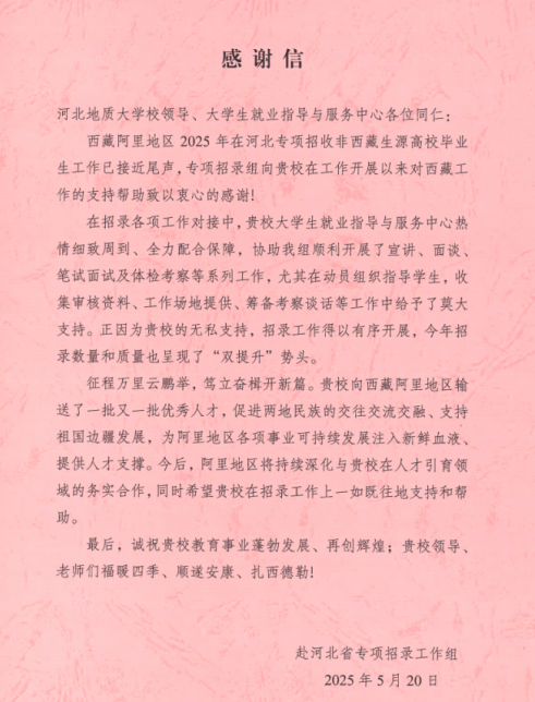 5月20日,西藏阿里地区专项招录工作组向BB贝博发来感谢信,向BB贝博艾弗森官网校领导、大学生就业指导与服务中心在西藏阿里地区专项招录工作中提供的支持帮助致以衷心的感谢。