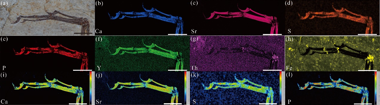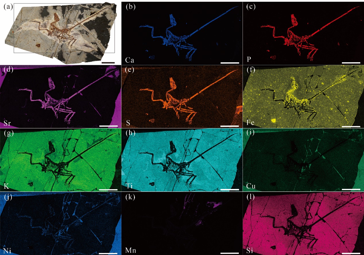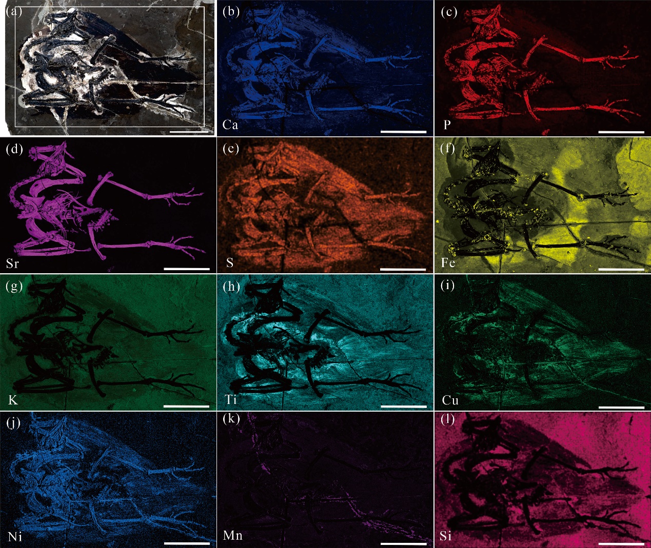 分析结果表明骨骼中Ca、P、Sr和Y的富集可能与生物磷灰石相关;羽毛中富集的Cu与黑素体有关,Ti的存在源于后期石化过程;爪鞘中的P和Ca是通过磷酸盐化保存下来;关节和躯干处富集的Fe与骨骼无关,可能与黄铁矿有关。