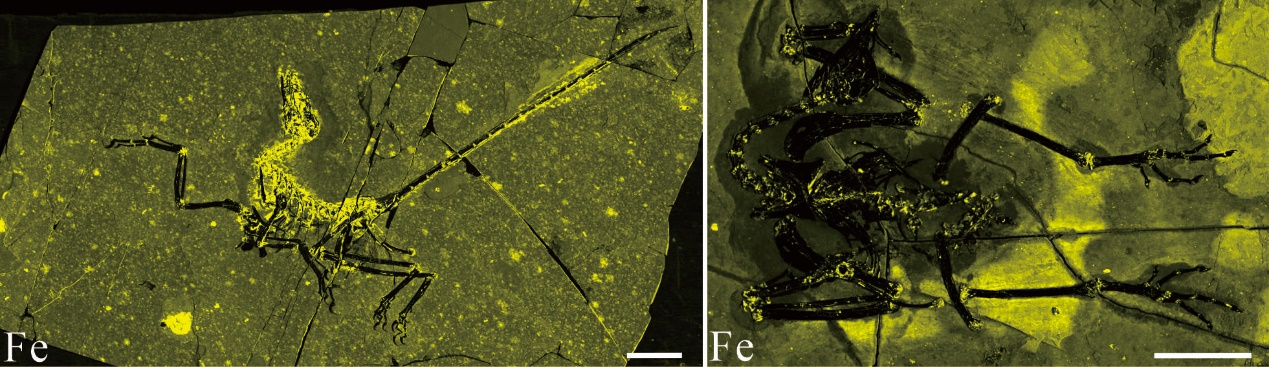 通过micro-XRF获取的元素数据,分析了热河生物群九佛堂组小盗龙和燕鸟两件副鸟类标本的元素分布模式。通过对比骨骼、羽毛、爪鞘以及围岩中的有效元素分布模式,发现骨骼主要由Ca、P、S和Sr组成,并且Y也与骨骼相关(图1和图2);羽毛相关的元素为Cu、Ni和Ti;爪鞘中P和Ca的含量很高(图3)。此外,在两件标本的关节处以及小盗龙的身体躯干部位发现了大量的Fe(图4)。