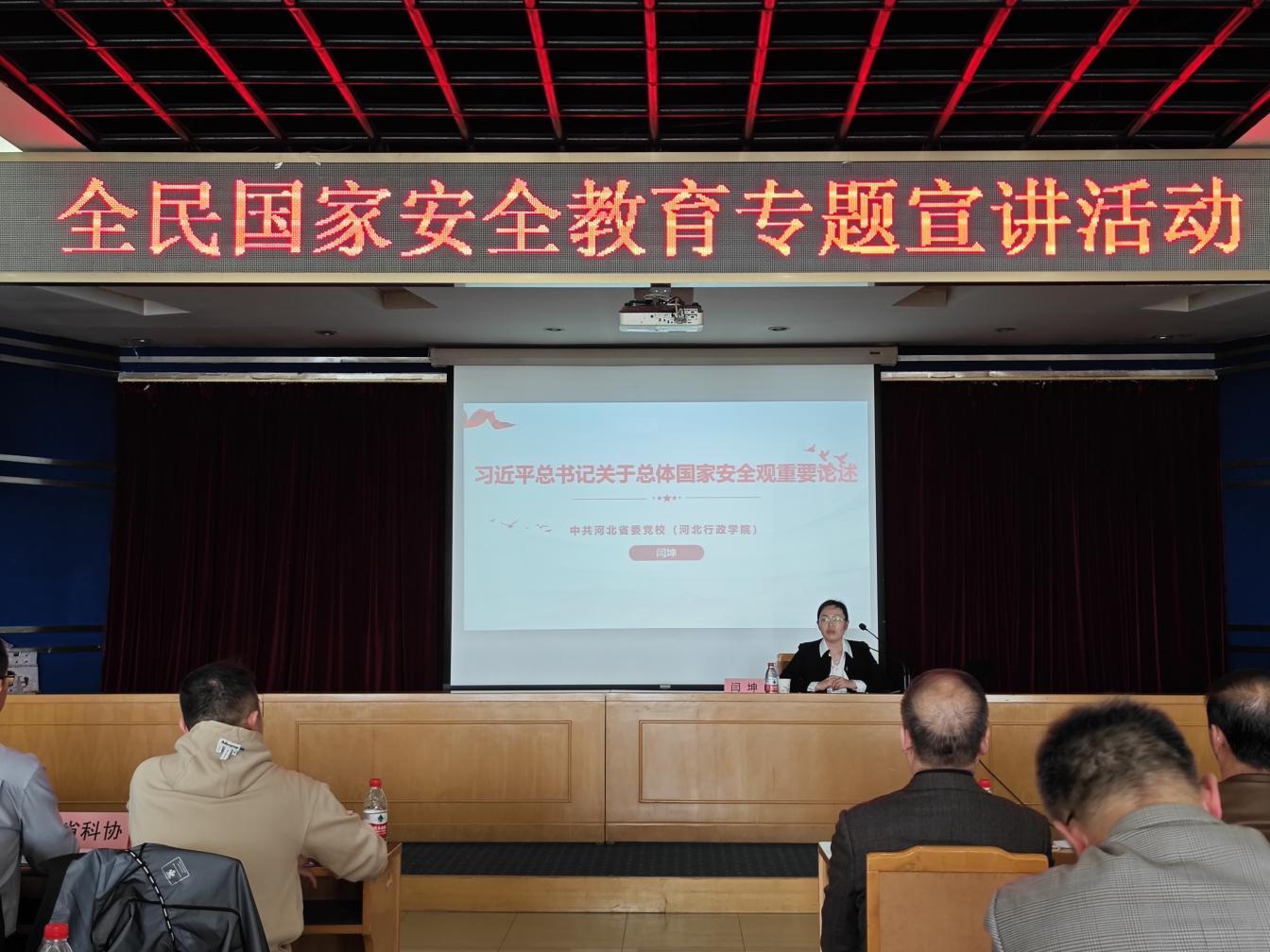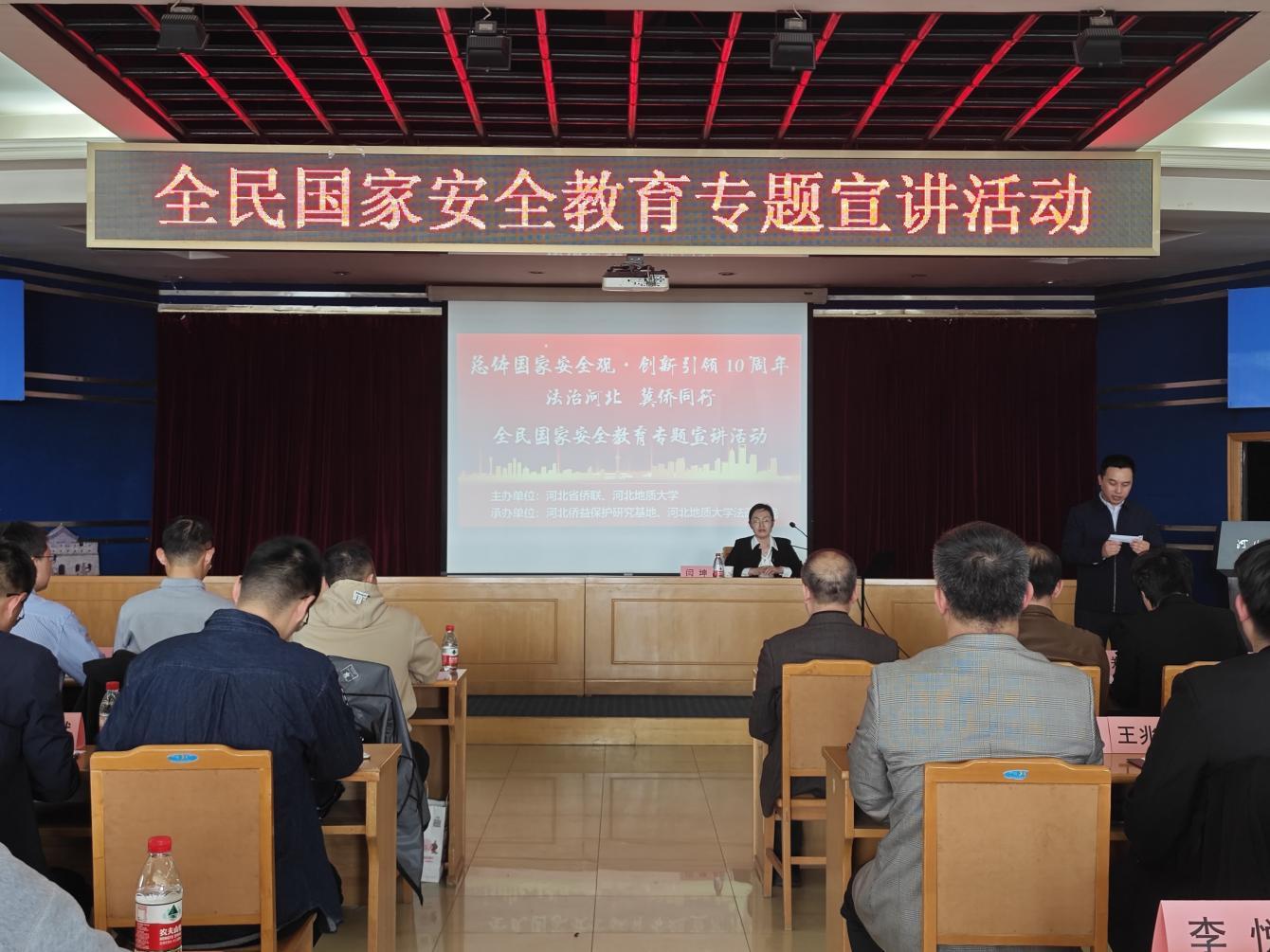 为深入学习贯彻习近平总书记关于全面加强国家安全教育日的重要指示批示精神,推动大安全理念深入人心、落地生根,在第9个国家安全教育日来临之际,4月11日,由河北省侨联、BB贝博艾弗森官网主办,河北侨益保护研究基地、BB贝博艾弗森官网法政学院承办的“总体国家安全观·创新引领10周年 法治河北,冀侨同行全民国家安全教育专题宣讲活动”在BB贝博艾弗森官网学术报告厅成功举办。省直机关“联学共建”第十一协作组有关单位省地震局、省科协、省科工中心、河北联通、华能河北新能源发展有限公司、省贸促会、省法学会、中国石油河北销售公司、省社会主义学院,省侨联委员、青年委员、法顾委委员、侨商、BB贝博艾弗森官网部分师生参加本次活动,省侨联侨益保障部陈国光部长担任此次活动主持人并发表致辞。