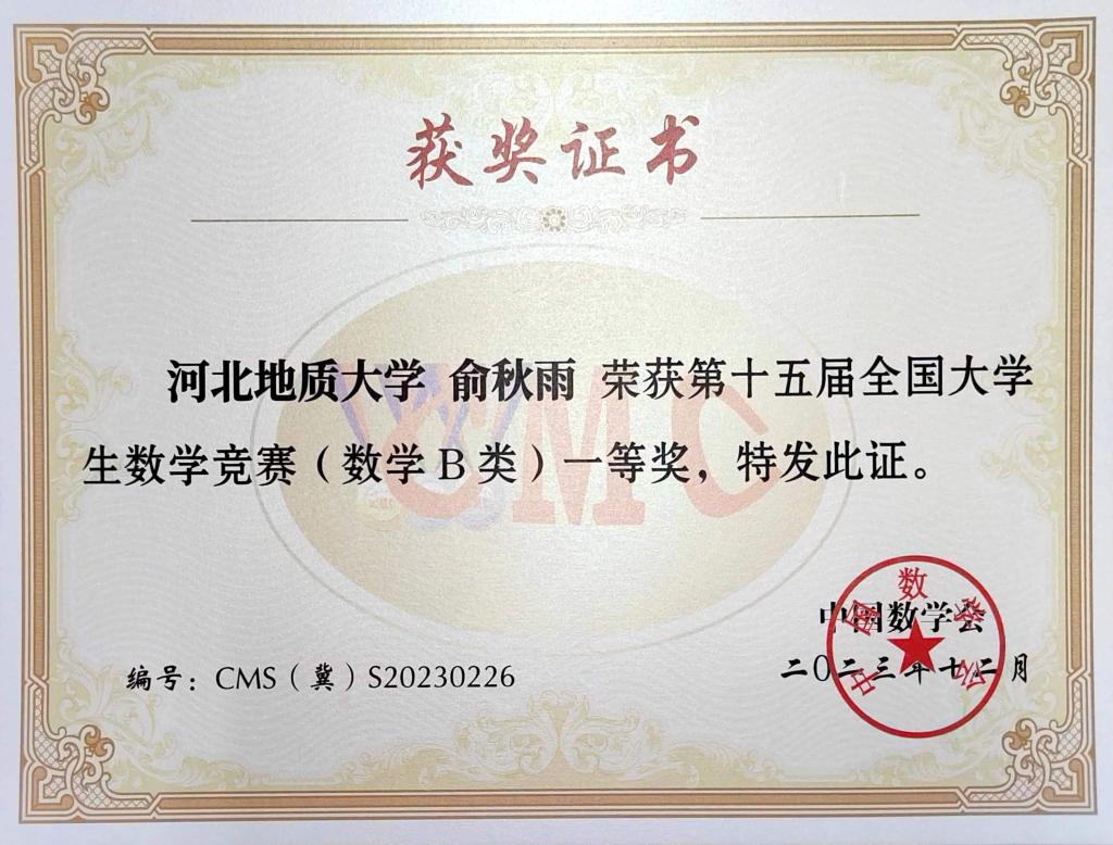第十五届全国大学生数学竞赛分为初赛和决赛,BB贝博2021级数学与应用数学专业学生俞秋雨获数学B类第8名,将代表河北赛区参加第十五届全国大学生数学竞赛决赛。这是BB贝博学生第二次进入全国大学生数学竞赛决赛,是第十二届全国大学生数学竞赛后的又一佳绩。