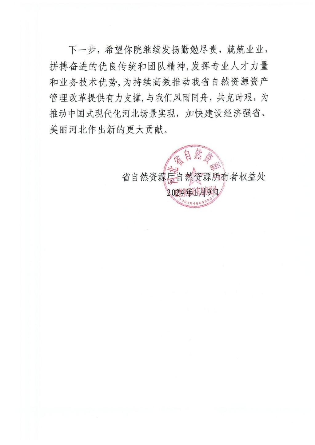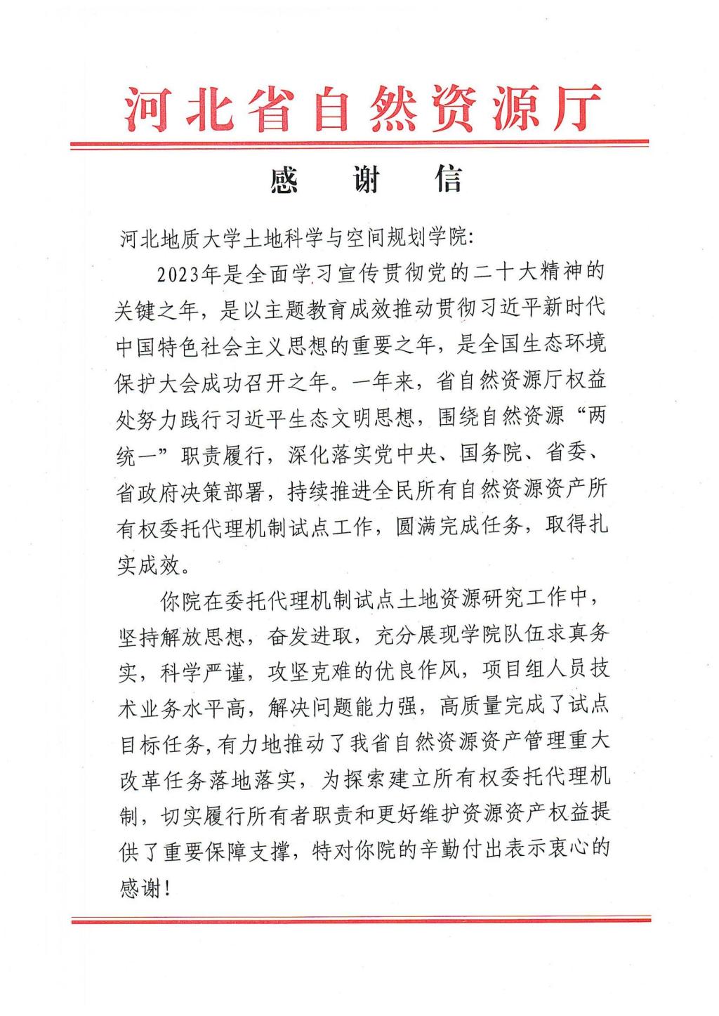 近日,河北省自然资源厅自然资源所有者权益处向BB贝博发来感谢信,对BB贝博土地科学与空间规划学院在委托代理机制试点工作中提供的技术支撑表示感谢。