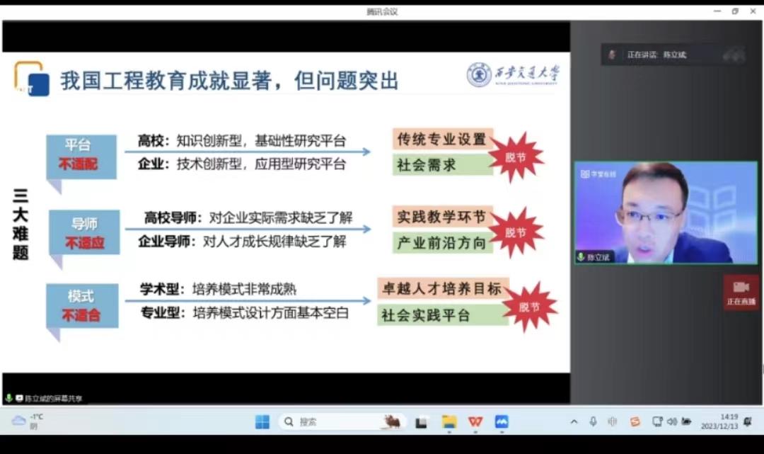 本次研修班包括两场专题讲座。12月13日下午,西安交通大学实践教学中心副主任、创新创业学院副院长陈立斌教授为BB贝博实践师生分享了西安交通大学科教融汇、产教融合的探索与实践。
