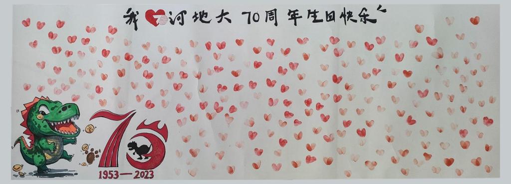 在现场的六米手绘长卷上,学生们用书法和绘画的展现形式表达了对学校的祝福,绘制的校徽、生动可爱的小恐龙、融入校庆标识的爱心祝福,还有学校领导和师生在长卷上摁出来手印爱心,都形象表达了地大人对学校满满的热爱。