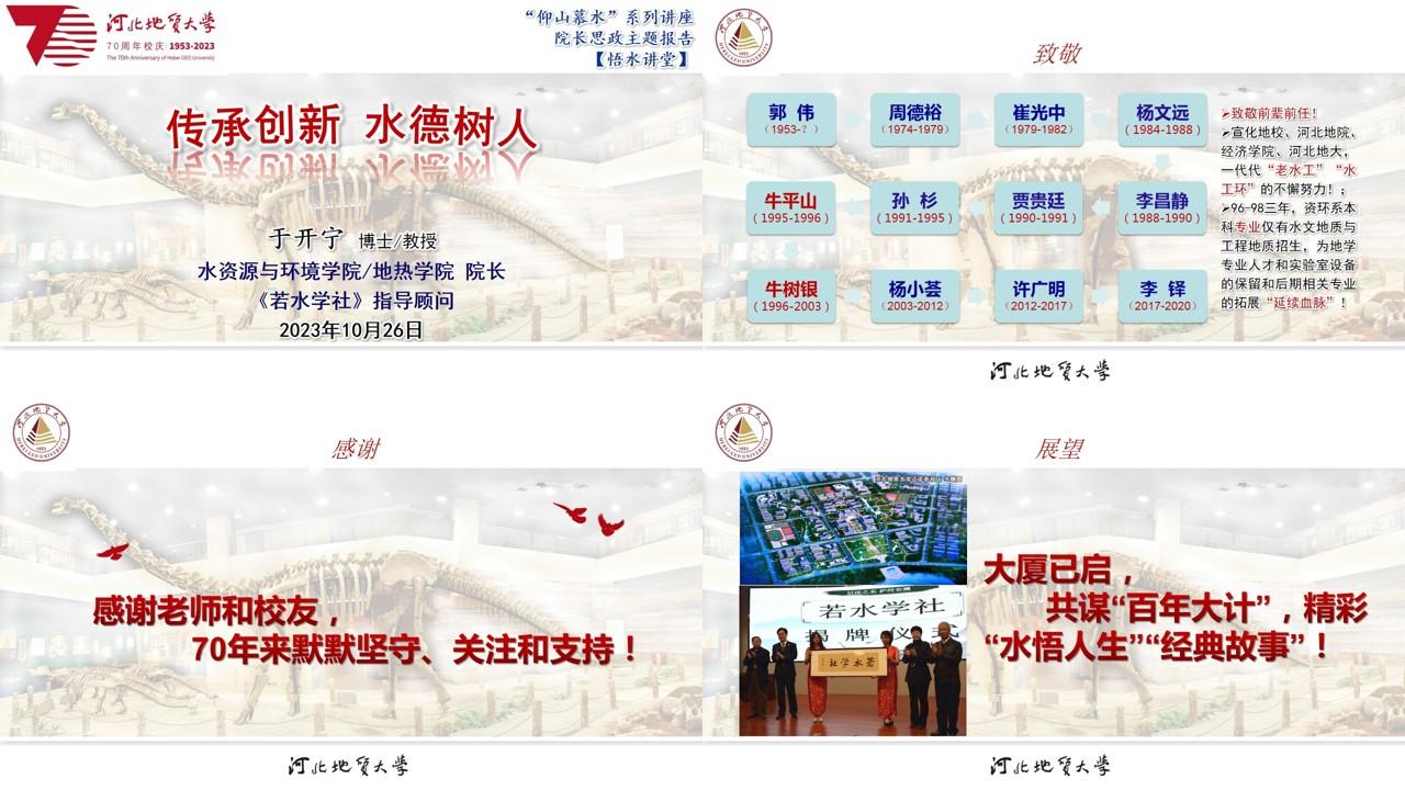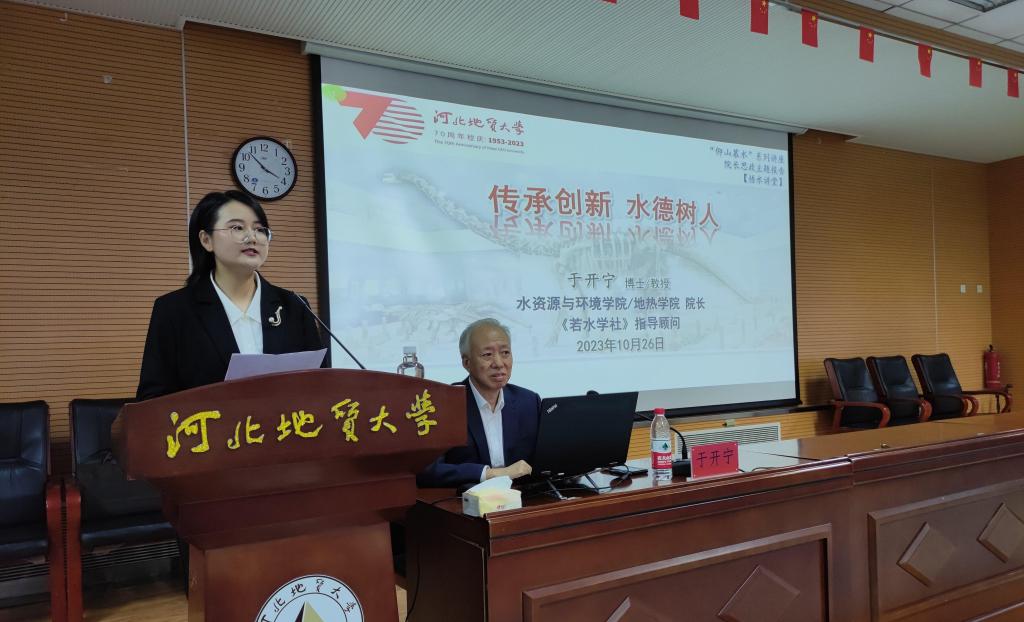 于开宁院长以“传承创新,水德树人”为主题展开演讲。首先感谢同学们的热情欢迎和主持人的热情洋溢的介绍,表达了对“金秋十月”水文化系列活动的重视和本次讲座活动的期许。