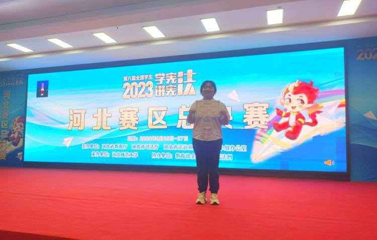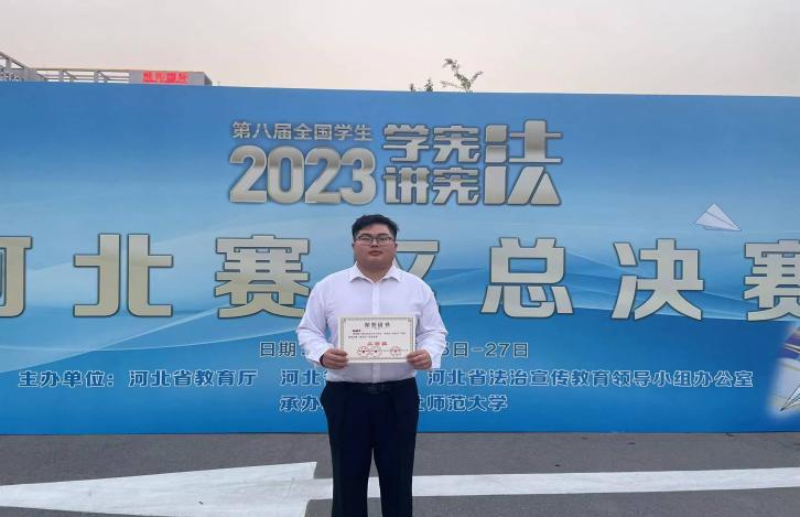 9月25日至9月27日,第八届河北省大中小学生“学宪法 讲宪法”大赛在石家庄市裕华区观和国际酒店举行,BB贝博法政学院2022赵启悦、2021级向桓平分获素养竞赛(高校组)省级决赛一等奖和演讲比赛(高校组)省赛决赛二等奖,为70周年校庆增光添彩。