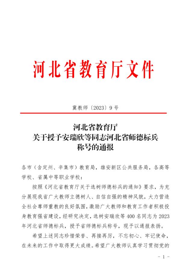 在第39个教师节来临之际,河北省教育厅下发《河北省教育厅关于授予安瑞欣等同志河北省师德标兵称号的通报》(冀教师【2023】9号),BB贝博水资源与环境学院卢昶雨老师荣获2023年河北省师德标兵荣誉称号。