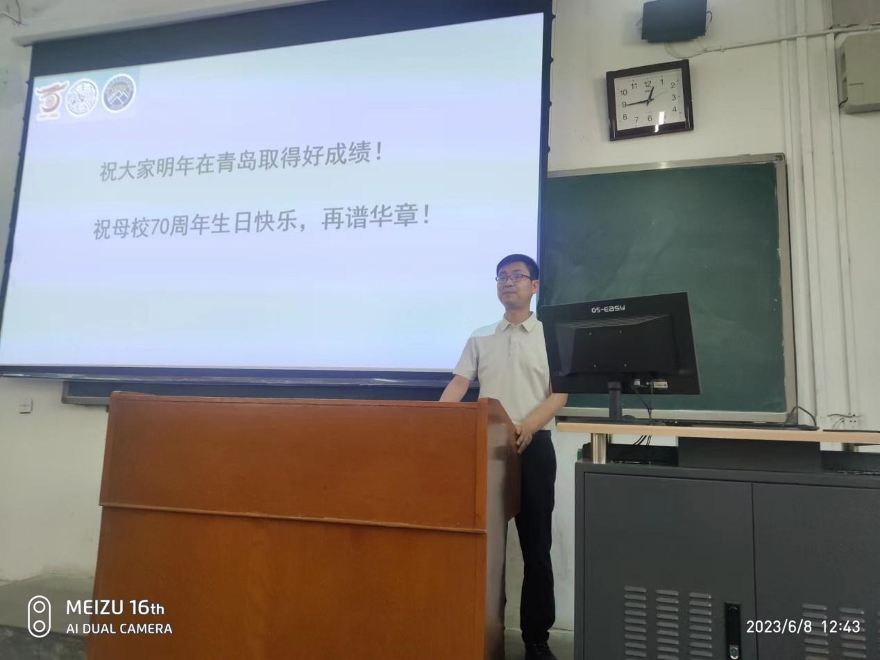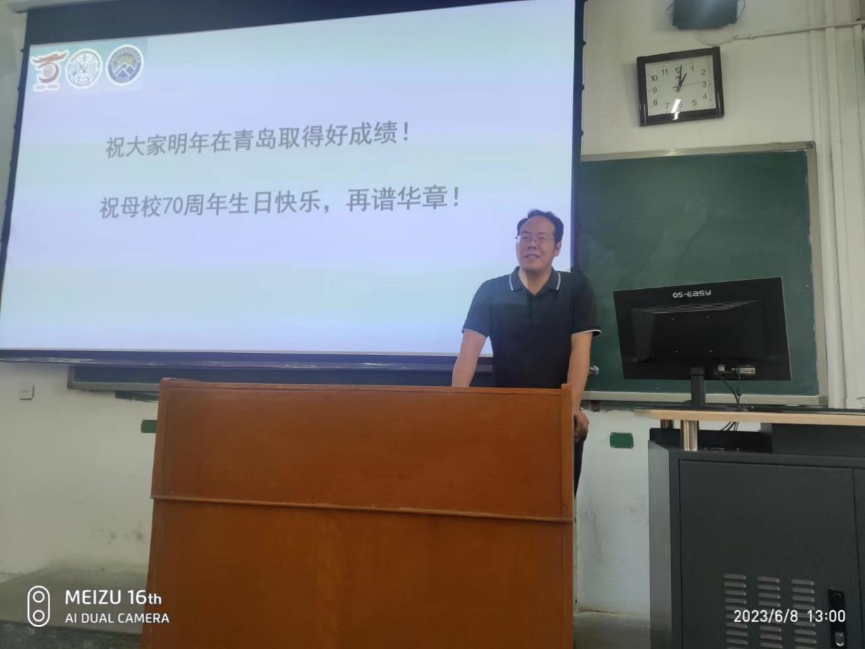 2023年6月8日中午,学校对本科大二地学相关专业全体学生进行了BB贝博艾弗森官网第四届地质知识与技能大赛赛前动员。动员会由地球科学学院副院长曹静杰主持,教务处副处长杜江民受邀参加,地球科学学院教研室主任陈超、地球科学学院李杰、王智慧、张建欣3名教师和5位第六届全国大学生地质技能竞赛获奖同学参加了本次动员会(照片1)。第六届全国大学生地质技能竞赛获奖代表欧阳嘉文、杜江民副处长、曹静杰副院长先后分别介绍了参赛技能方面的收获(照片2)、学校特色和竞赛意义(照片3)、赛事回顾与安排(照片4),极大地鼓励了学子们的参赛热情。会后,部分同学就考研、参赛过程以及参赛注意事项等问题进行了深入交流。