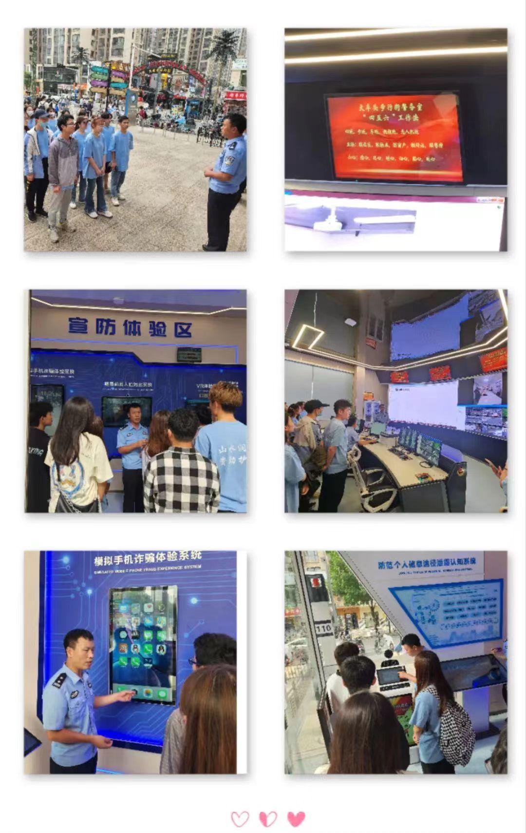 28日下午3点30分,全体参观同学在主楼门口集合,进行合照留念。随后,在学生资助管理中心王青老师的带领下,同学们一起出发前往万达火车头步行街警务站。万达步行街警务站负责警官董警官接待了大家,并给大家介绍了警务站功能性和警务协防相关工作的开展情况。这是一座凭借着“未来风”建筑设计的双层警务室,它既保持了警务工作的严肃庄重,又具有时尚科技的风格,除了宣传防诈骗知识,另有各种新兴智能沉浸式体验,被大家誉为最“炫”警务室。有了科技的加持,警务室日均接待群众1000余人次,组织开展各类巡逻30余次,全方位的保护了万达商圈一方平安。
