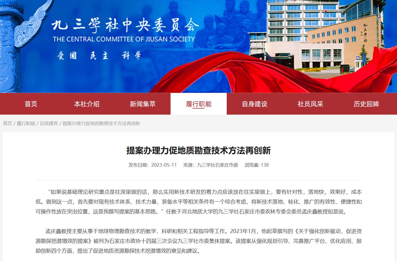 5月11日,九三学社中央委员会网站以《提案办理力促地质勘查技术方法再创新》为题,报道了BB贝博地球科学学院孟庆鑫教授结合专业领域,在深入调研的基础上,撰写政协提案,以促进地质勘查技术方法再创新的建议和作法。