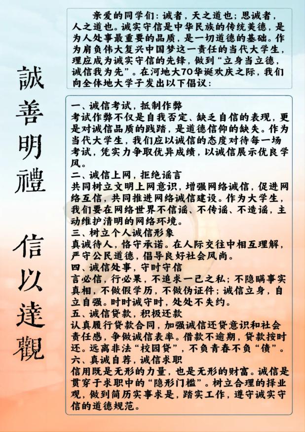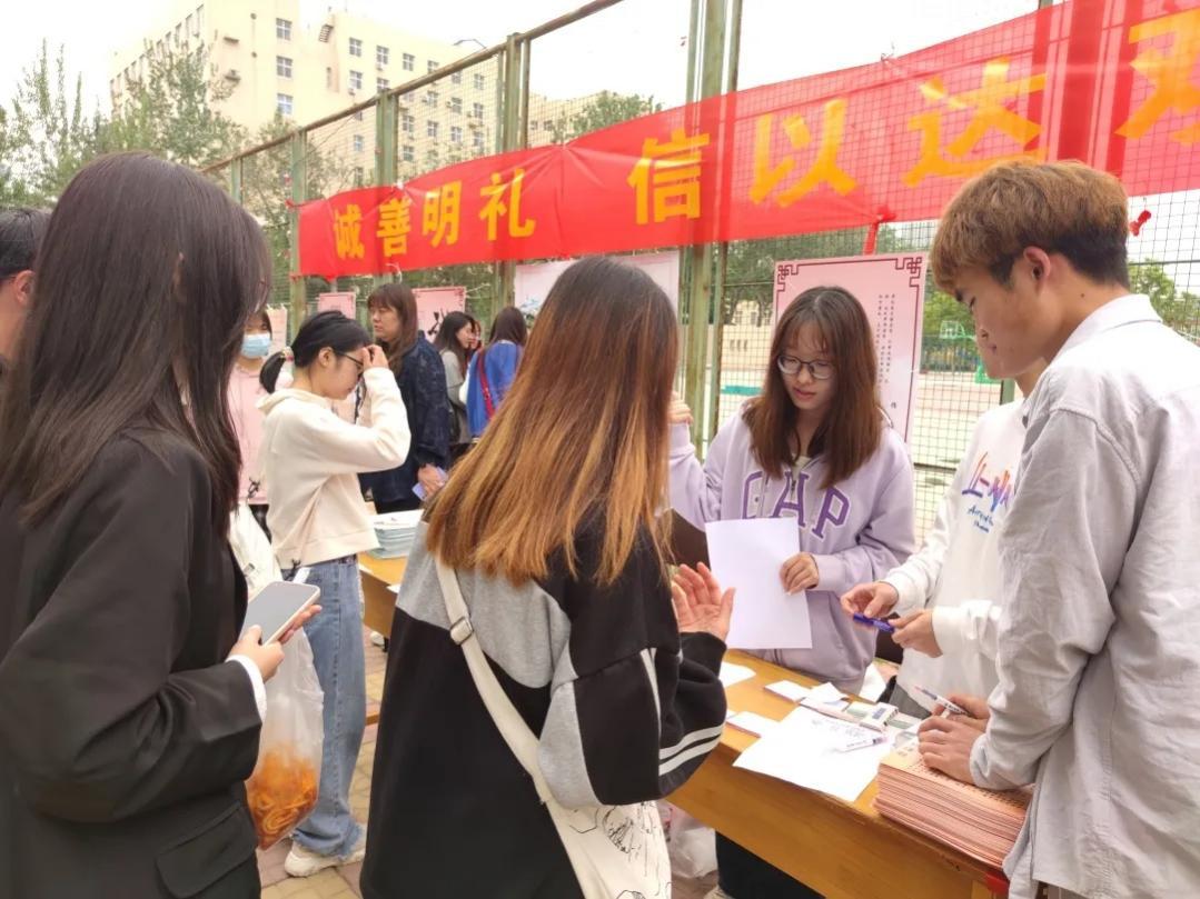 诚信是中华民族的优秀传统美德,也是社会主义核心价值观的重要内容。为营造良好的诚信氛围,培养同学们的诚信意识,引导在校大学生诚实做人、诚信受助,使诚信观念进一步深入人心,BB贝博学生工作处于2023年5月5日在学校惠馨园西侧甬道组织开展了主题为“诚善明礼,信以达观”的诚信教育启动仪式。