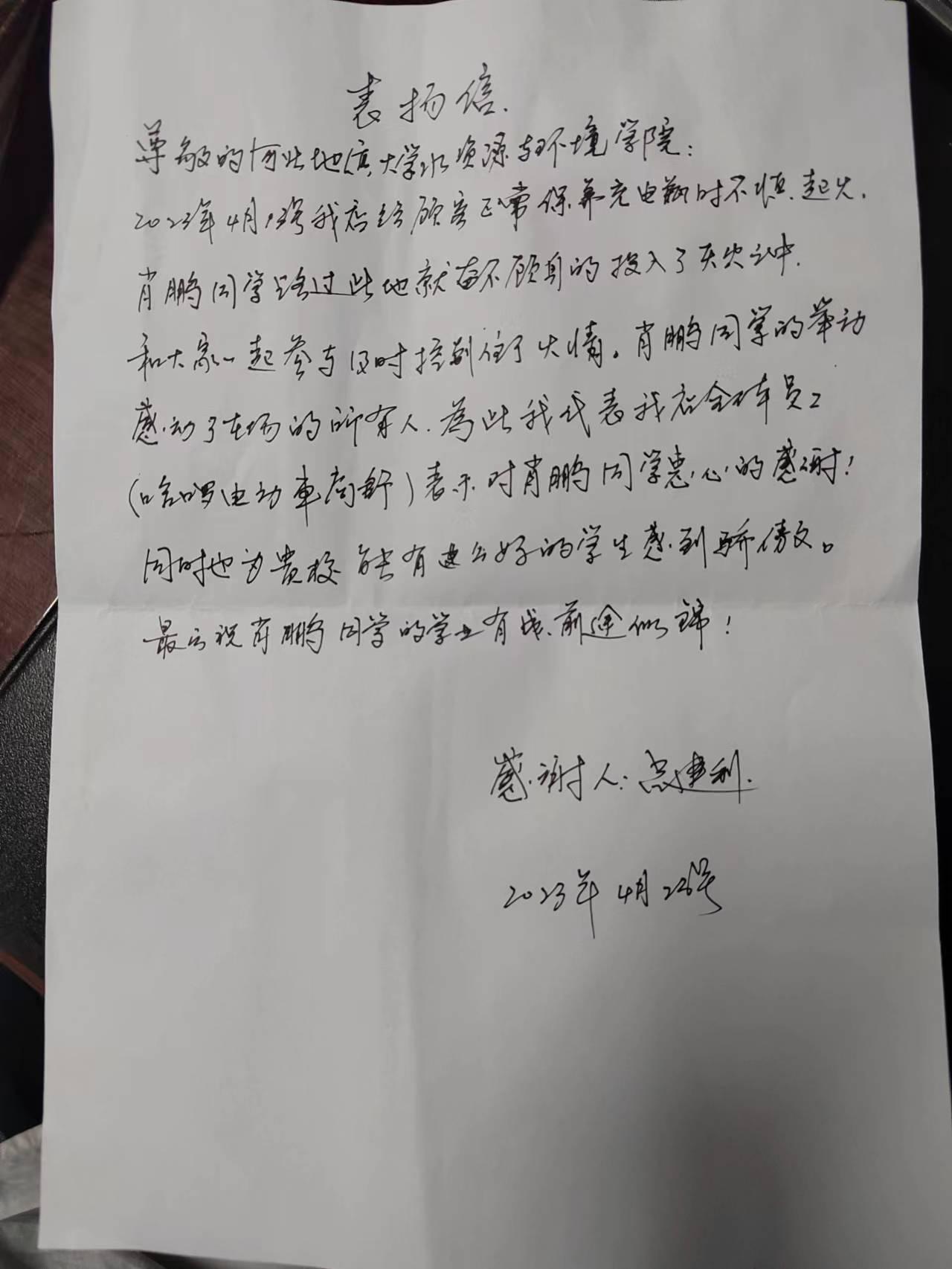 2023年4月13日下午16时许,BB贝博艾弗森官网水资源与环境学院学生肖鹏在石家庄市怀特大厦怀特电动自行车商城B1区租共享电车时,突然遭遇由仓库电池爆炸而引起的火灾。情况严峻危急,但肖鹏同学挺身而出,最终完成救火。