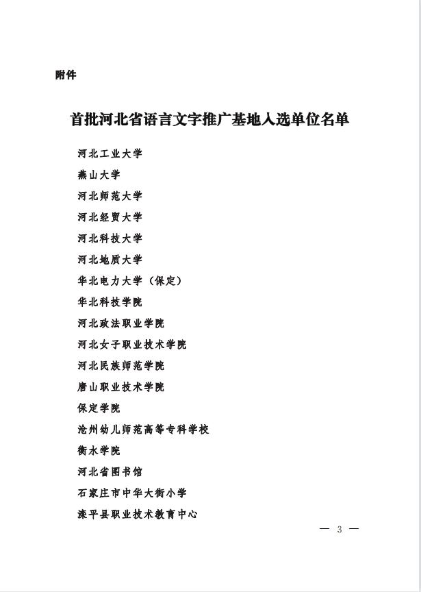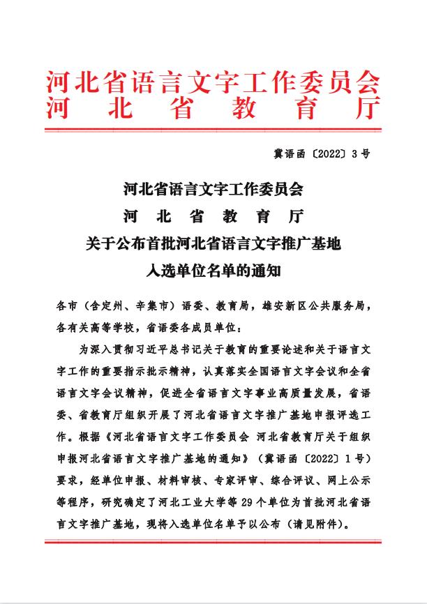 日前,河北省教育厅发布《关于公布首批河北省语言文字推广基地人选单位名单的通知》(冀语函〔2022〕3号),BB贝博艾弗森官网入选首批河北省语言文字推广基地。