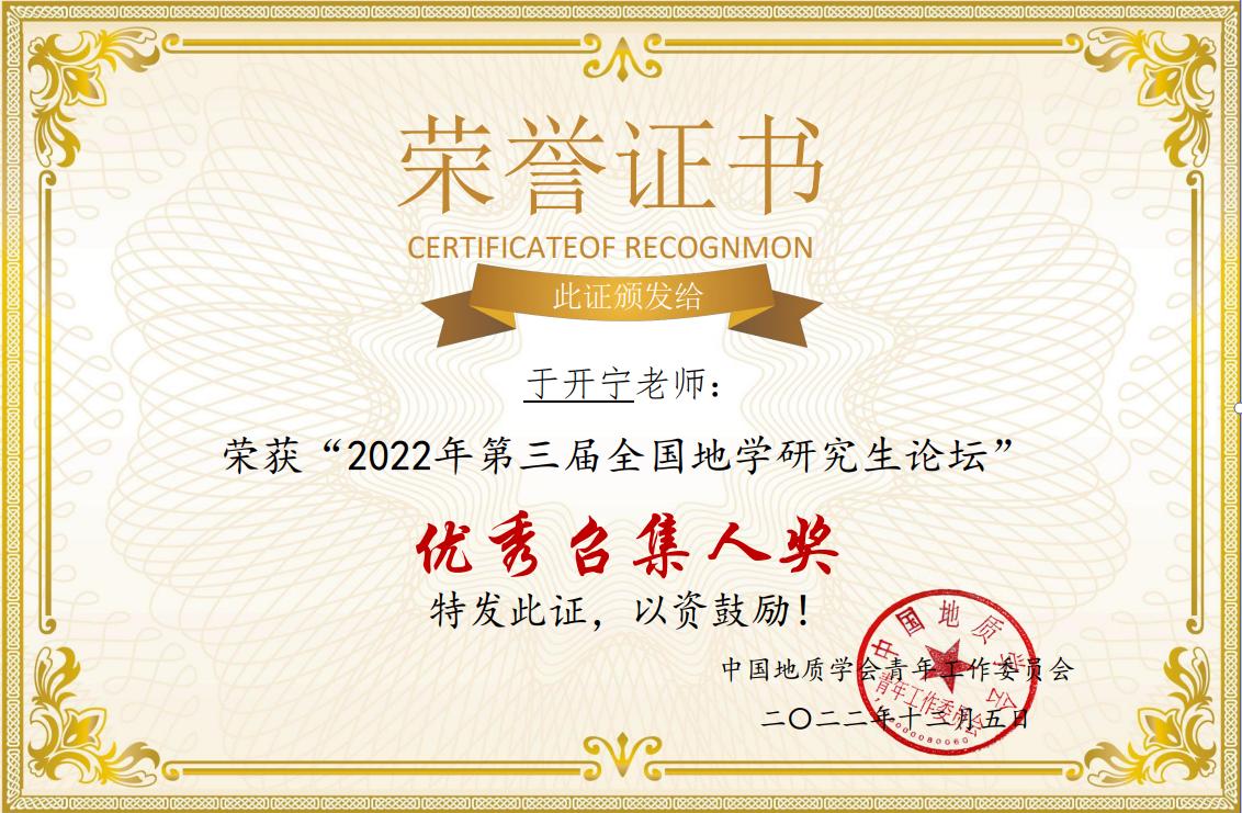 闭幕式上,组委会公布了各奖项的获奖名单,于开宁教授荣获“优秀召集人奖”,所指导的研二王润忠同学与吉林大学邓远东、中国地质科学院郭骏瀚、吉林大学王伟安、长安大学吴翔、西南交通大学尹青青、成都理工大学周欣悦等7位研究生荣获“优秀论文奖”,这些论文将以推荐信形式推荐至国内知名地学学术期刊发表。本次论坛确定下一届的举办地为陕西西安,预计召开时间为2024年11月,将由长安大学、西北大学联合当地高校和科研院所共同承办。