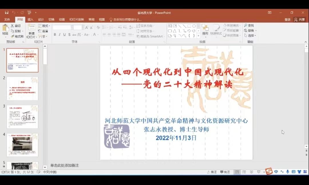 11月3日下午,数理教学部邀请教育部人文社科重点研究基地河北师范大学中国共产党革命精神与文化资源研究中心教授、博士生导师,河北省晋察冀边区研究会副会长张志永教授,以《从四个现代化到中国式现代化》为题作党的二十大精神解读专题报告会。数理教学部党委副书记董昌州主持会议,BB贝博师生共150余人聆听了本次报告。