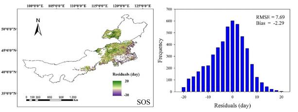 该研究表明了土壤水分和降水与植被生长季开始期(SOS)呈线性相关,而其他变量与SOS呈非线性相关。同时,土壤水分、风速和太阳辐射被发现与植被生长峰值(POS)呈正相关,而其他变量与POS呈显著负相关关系。此外,研究还发现了前一年的大气变量对下一年的SOS产生了63%-85%的贡献度,而当年4-6月的大气变量均值对SOS产生了70-85%的贡献。通过建立GAM模型预测得到的SOS与POS与从卫星数据集中获取的值有明显的一致性,均方根误差约为3-5天。