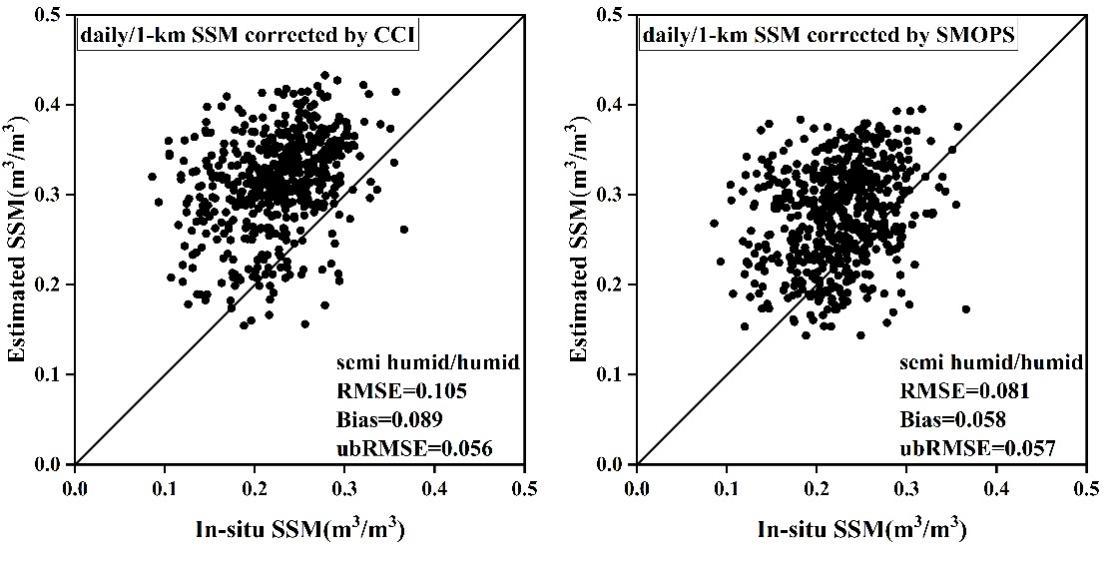 该研究基于热惯量理论,在较粗分辨率的再分析数据尺度上建立不同植被覆盖类型(林地、草地、耕地和裸土)和植被指数等级(稀疏、中等密度和稠密)下土壤水分与昼夜温差的关系模型,并将其扩展到公里级分辨率的MODIS尺度。随后,基于两种主被动融合的微波土壤水分产品(CCI与SMOPS)对其进行校正,进而获得最终的覆盖全国的全天候日尺度公里级土壤水分。经地面土壤水分实测数据验证,研究获得的全天候日尺度公里级土壤水分的无偏均方根误差接近0.05 m3/m3。该研究构建了基于已有主流再分析数据与遥感数据获取全天候日尺度公里级土壤水分数据的实用框架,为生产长时序高空间分辨率土壤水分产品奠定了基础。