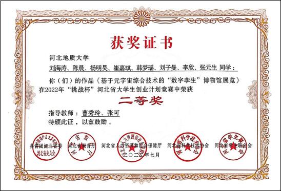 近日,由共青团中央、中国科协、教育部、全国学联和地方政府多个机构联合举办的2022年“挑战杯”河北省大学生创业计划竞赛公布了获奖名单。经过省级复赛、省级终审决赛两个阶段的评审,BB贝博城市地下空间工程专业参赛团队准备的作品《基于元宇宙综合技术的“数字孪生”博物馆展览》在竞赛中敢于突破,勇于创新,荣获河北省二等奖。参赛学生分别为刘海涛、陈晨、杨明昊、崔嘉琪、韩梦瑶、刘子曼、李欣和张元生八位同学,指导教师为曹秀玲教授和张可老师。