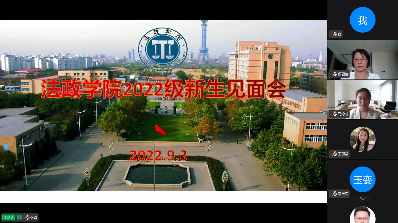 本次线上新生见面会由法政学院党委副书记朱晓玲主持,参加人员有法政学院院长侯丽艳,党委书记马沁芳,副院长秦玉娈、孙日华,法学系主任李慧英,公共管理系主任王丽慧,2022级新生辅导员张颢以及240名2022级法政学院新生。