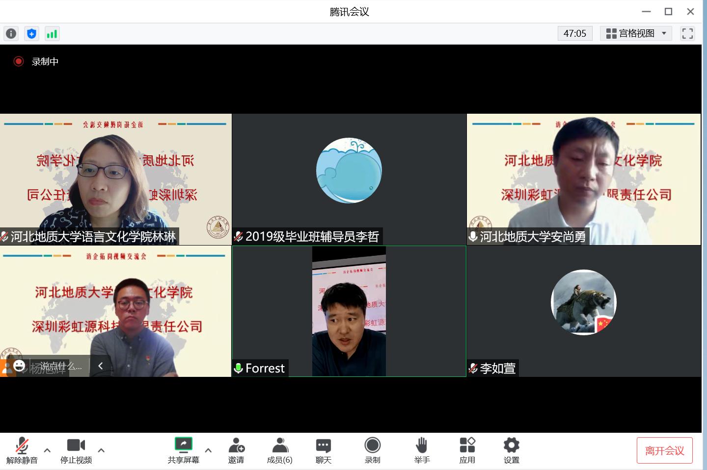 为拓展毕业生就业市场和学生实习岗位,语言文化学院领导班子继续积极开展“访企拓岗促就业”活动。9月2日下午,语言文化学院与深圳彩虹源科技有限公司在线上座谈,对学生实习、就业等方面开展合作进行了商谈。学院党委书记林琳、党委副书记杨旭辉、副院长安尚勇、毕业年级辅导员李哲,彩虹源科技有限公司总经理、BB贝博2005级英语专业校友霍景金参加座谈。杨旭辉主持了座谈会。