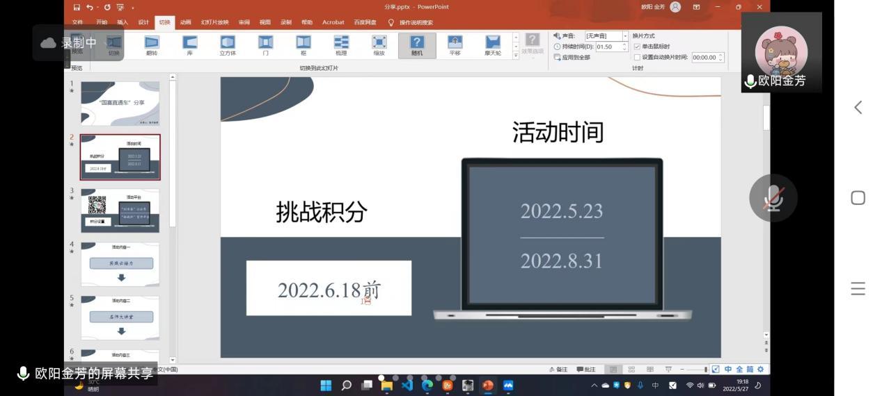 分享人杜成玉分别从活动详细内容、积分主要获得方法等方面展开分享,介绍了在参加名师大讲堂、实践云接力过程中的主要事项,并将往届国赛直通车活动与今年活动进行了仔细对比,指出了两者不同之处以使得参赛选手更好的应对变化。