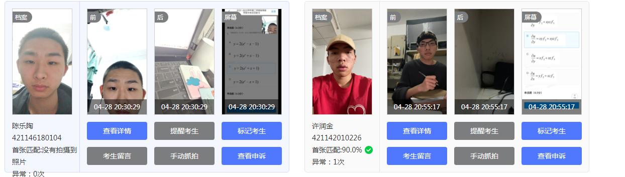 针对第一次大规模地在线考试,教学部多次召开专题会议讨论研究,组织教师参加线上监考培训,在全体师生的精心准备下,教学部承担的全校公共课程《高等数学》和《概率论与数理统计》按期组织进行了期中考试,积累了丰富的线上考试经验。此次期中考试,共组织了125场,约6500人次参加,学生通过学习通平台作答,监考采用线上线下同时进行,线上为学习通后台监考,安排监考老师45人次,线下教室监考在教室摄像头监控的同时安排10余人次监考教师巡考,既能严肃考场纪律,又能及时解决学生考试过程中遇到的各种问题,保证考试顺利进行。对于不在学校的考生,采用双机位形式进行监考,一方面通过学习通后台监控考试情况,另一方面,在考试过程中全程以钉钉群视频会议的方式监考,防止作弊,同时及时沟通,解决问题。考试过程中,大部分学生能够按照考试要求,诚信参考,不作弊,不违规,展现了良好的学风。全部考试环节全程监测,做到数据留存,监考巡考到位,考试流程规范顺畅。通过不打折扣的线上考试,既考察教学效果精准提升教学质量,又助推了现代信息技术与教育教学改革的深层次结合。