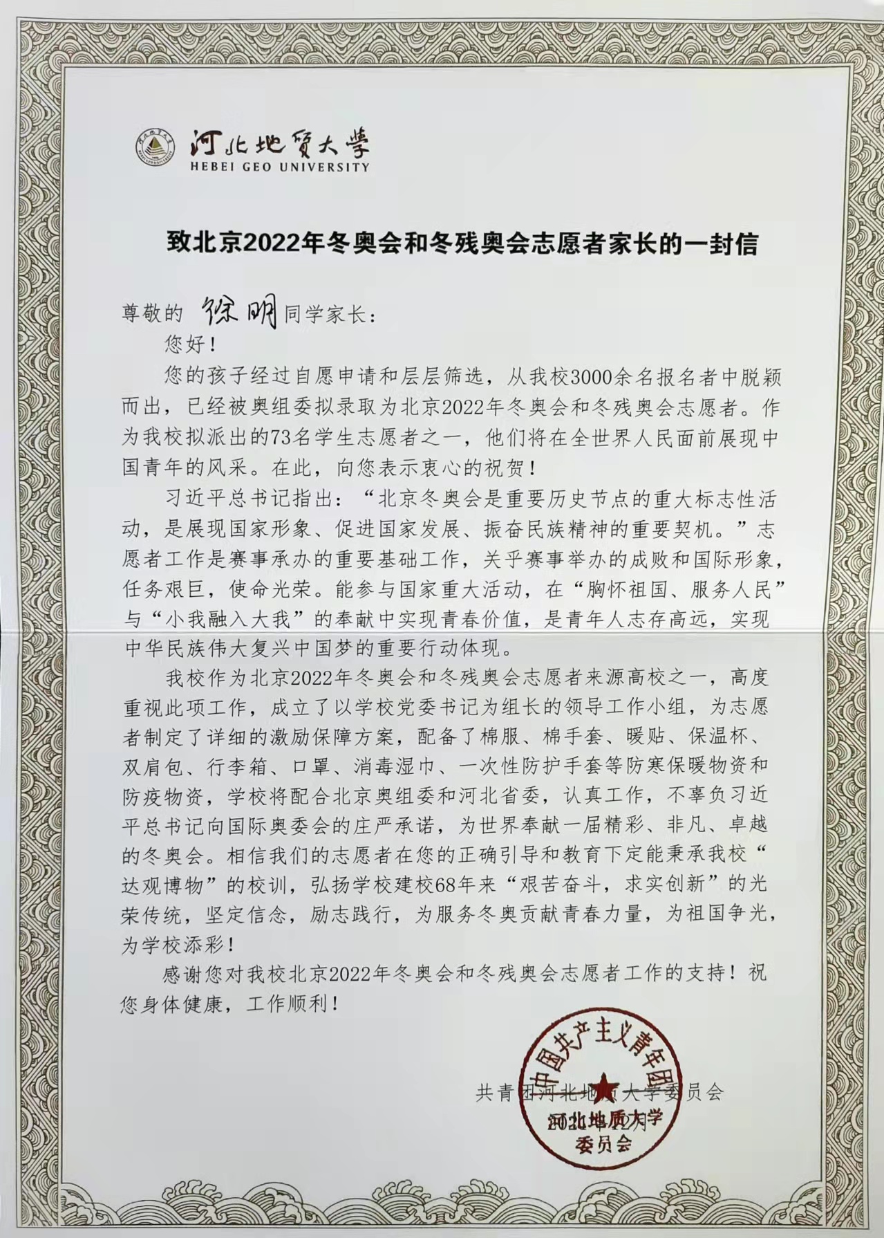 为表达学校对冬奥会学生志愿者家长的感谢,解决家长的后顾之忧,使家长更全面了解志愿者的情况,让其能够安心、放心,12月2日,校团委为BB贝博68名学生志愿者家长致信并邮寄到家中。