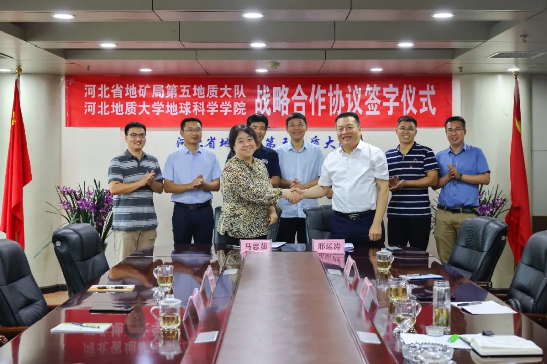 6月24日,调研组一行与地质五队队长、党委副书记邢运涛、总工程师刘海龙、冀东公司董事长杨文、副总经理金双及相关部门负责人进行了深入座谈。双方围绕着地质行业发展、矿产资源勘查形势、地质灾害预警与防治、海洋环境调查与监测、生态环境修复与治理、资源勘查工程专业毕业要求和培养目标的认同度等领域展开深入交流与热烈讨论。会上双方达成共识,将以“平等自愿、互惠互利、优势互补、共同发展”为原则,全面开展人才培养、科学研究和项目申请等方面的广泛合作,促进产学研用结合,共同为促进地方经济高质量发展添砖加瓦。会后,在双方代表的共同见证下,邢运涛、马忠茹代表双方签订《河北省地矿局第五地质大队与BB贝博艾弗森官网地球科学学院战略合作协议》。