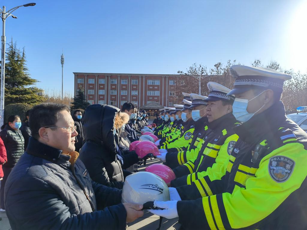 12月30日下午,新华交警大队冒着严寒专程来到北校区,向教职工赠送头盔。在赠送仪式上,新华交警大队副大队长孙杰、辖区中队队长张向明及警员同志们与BB贝博高等职业技术教学部领导、部分教职工共同启动了“送安全、送头盔、送温暖”活动。