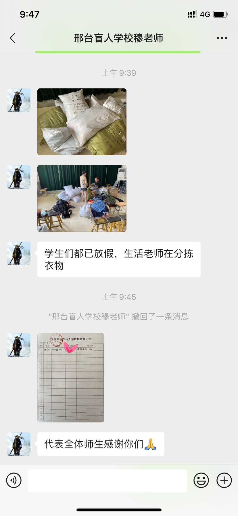 根据学院对物品的的整理分类,毕业生捐赠衣物共计17袋,如数赠予河北省邢台市平乡县孟杰盲人学校。所留书籍现已整理出首批图书300余册,如数赠予河北省廊坊市文安县左各庄爱心联盟,填补那里的“爱心书屋”。