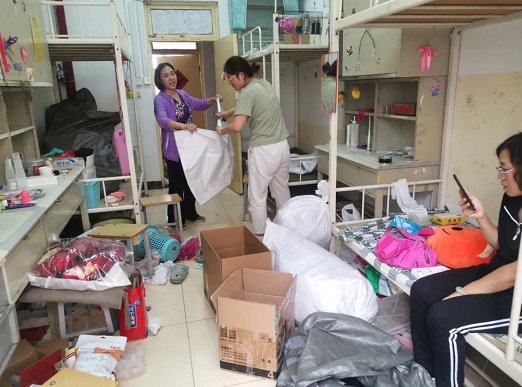 王滨副校长亲临学生宿舍指导工作,学院领导全部投入学生行李物品的整理和打包过程,确保每一件行李物品都能完好的寄送到毕业生手中。