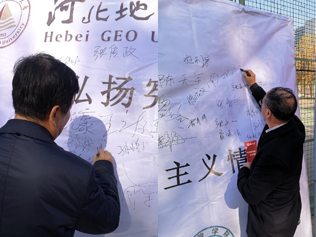 在宪法宣传活动现场,邢承国书记、南振兴副书记和师生一起在宣传板上签字
