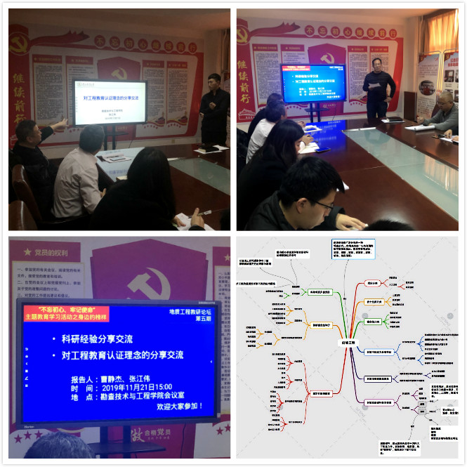随着“不忘初心、牢记使命”主题教育的推进,学院党总支结合新时代高校党建示范创建、质量创优(简称“双创”)工作,根据学院综合改革的进程中适时总结、交流的安排,实行在教师党员队伍中开展党建引领学院发展的新举措,开展以党员的先进性引领群众、以党员中的榜样引领党员的“身边榜样”活动。11月21日下午,勘查技术与工程学院举办了“不忘初心、牢记使命”主题教育之身边榜样活动。本次活动以科研典范和教学改革研究典范围绕“科研经验”和“工程教育认证理念”两方面内容的交流展开。会议由学院党总支书记黄万顺主持,全体教师党员参加了交流会。