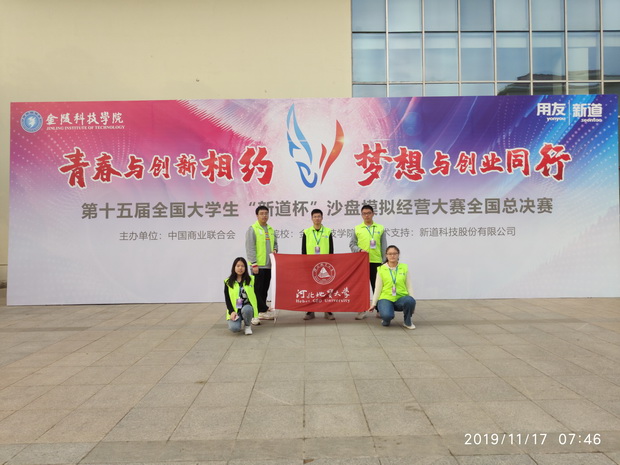 2019年11月15日—17日,BB贝博参加第十五届全国大学生"新道杯"沙盘模拟经营大赛全国总决赛。本次比赛由中国商业联合会主办,南京金陵科技学院承办,新道科技股份公司提供技术支持。经过激烈的竞争和角逐,由会计学院邢文松、郑可为、胡鑫娜、崔爱萍,土地资源与城乡规划学院习云杨五位同学组成的BB贝博艾弗森官网代表队获二等奖一项。