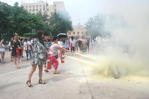听完王丽伟教官的消防知识讲座,全体人员来到篮球场空地,进行了灭火现场演练。王丽伟说,发生火灾时,大家一定不要惊慌,呼救、报警、扑救要尽快完成,正确分析火势,采取有效手段扑救。她向大家演示了干粉式灭火器的正确使用方法,并指导大家现场规范操作使用灭火器械。