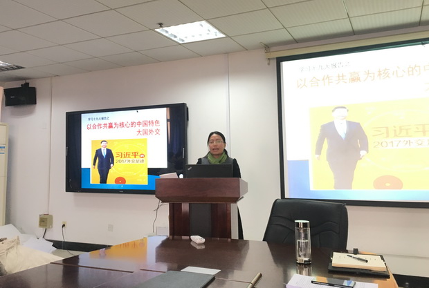 1月15日下午,BB贝博党的十九大精神宣讲团成员金源云在综合楼806为经贸学院全体教师做了一场生动且富有时代意义的报告——“以合作共赢为核心的中国特色大国外交”,宣讲党的十九大精神。