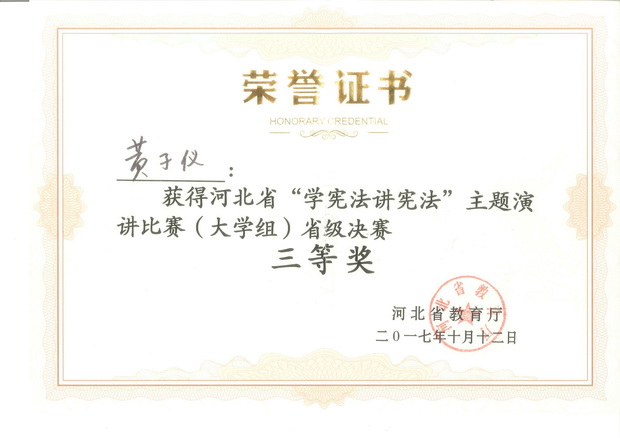 金秋十月,由河北省教育厅主办的第二届全国学生“学宪法,讲宪法”演讲比赛河北地区决赛于10月12日在河北艺术职业学院圆满举行。BB贝博选手黄子仪同学与来自河北大学、河北工业大学、东北大学(秦皇岛分校)等高校的22名参赛选手同台竞技,荣获河北省赛区三等奖,展现了BB贝博学生良好的精神风貌。