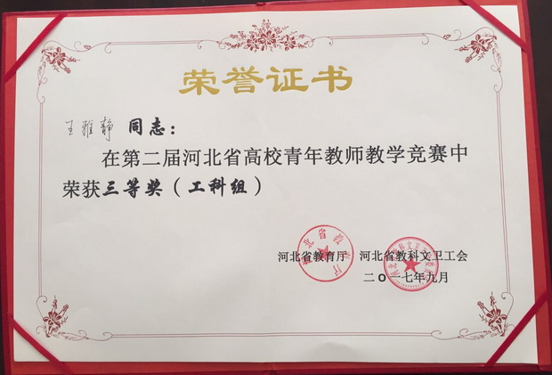 图为:王雅静获奖证书