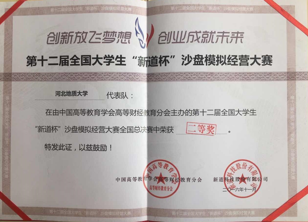 2016年11月26日至27日,“新道杯”第十二届全国大学生沙盘模拟经营大赛总决赛在桂林电子科技大学举办。来自全国各地122支代表队,共610名选手参加了此次比赛。BB贝博商学院赵俊翔、尹红利、会计学院黄鑫、刘祥、管理科学与工程学院王茜参加了比赛,通过努力,取得了大赛二等奖的优异成绩。