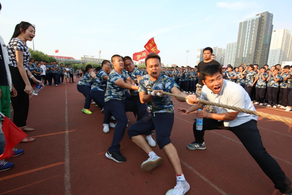 9月5日下午四点,本部的拔河比赛在体育场率先展开。比赛开始前,同学们个个精神饱满,意气风发,随着一声哨响,比赛拉开了帷幕。比赛双方都奋力拉着绳子,齐力拼搏,学长学姐们在一旁呐喊助威,教官也在一旁高喊着“一二一二”,各学院观众们热情的欢呼声把比赛推向了一个高潮。 教官之间进行的拔河友谊赛也成了本次比赛中绚丽的风景线。