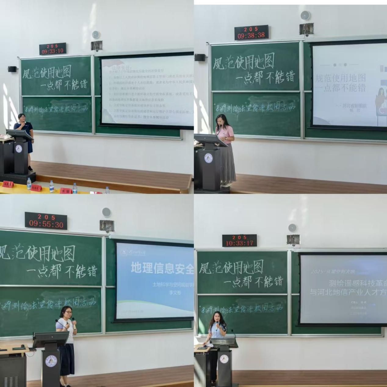 在主题报告环节,来自测绘单位的专家与BB贝博的教师先后进行分享。河北省第三测绘院杨娟芳以《加强测绘法制宣传,增强测绘法治意识》为题,结合实际案例解读测绘法律法规要点,引导与会者树立依法测绘、守法用图的意识;河北省制图院杨欣围绕《规范使用地图,一点都不能错》,从地图编制、审核、使用等环节入手,详解规范用图的重要性与实操要点,让“国家版图,一点都不能少”的理念深入人心;土地科学与空间规划学院教师李文彬聚焦《地理信息安全守护》,剖析当前地理信息安全面临的挑战与防护措施,为保障国家地理信息安全提供专业指引;河北地信集团李烨则以《从星空到大地:测绘遥感科技革命与河北地信产业人才方阵构建》为主题,回顾测绘遥感技术的发展历程,展望产业未来趋势,并结合企业实践提出校企协同培养高素质测绘人才的路径,为行业人才队伍建设注入新思路。
