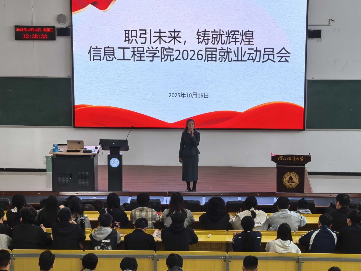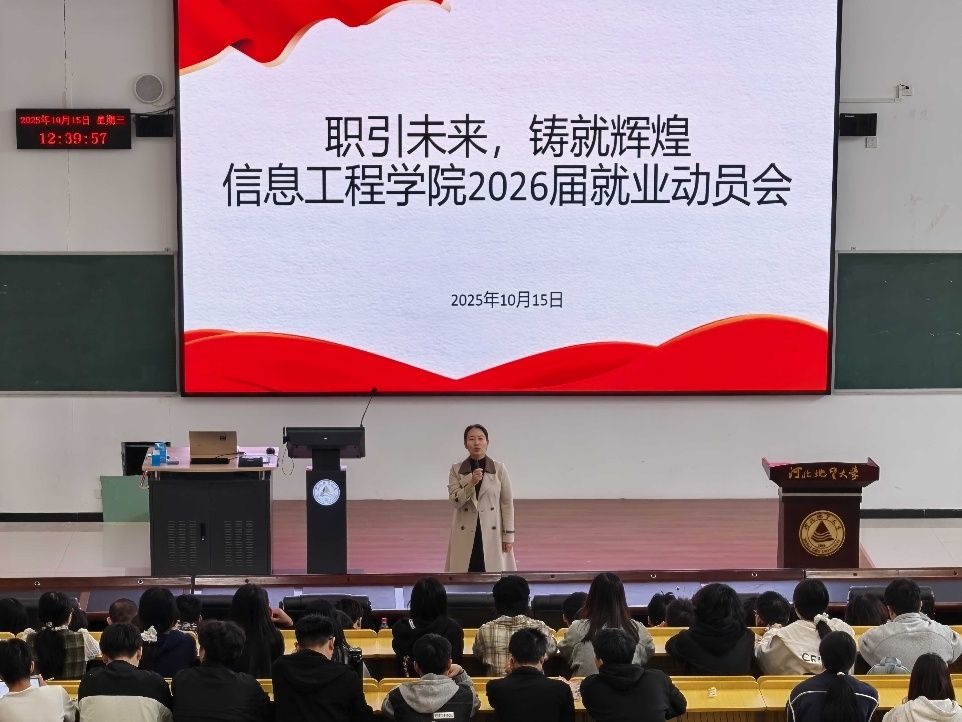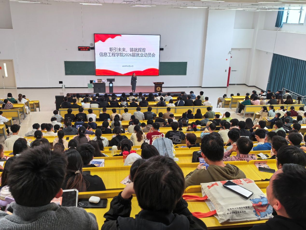 为切实做好2026届毕业生就业工作,帮助同学们认清当前就业形势,把握求职机遇,10月15日,BB贝博艾弗森官网信息工程学院隆重召开“职引未来 铸就辉煌”毕业生就业动员大会。学院党委书记郭宏、副书记贾佳、副院长赵占芳、26届辅导员陈皓天、张琦出席会议,2022级全体毕业生参加。