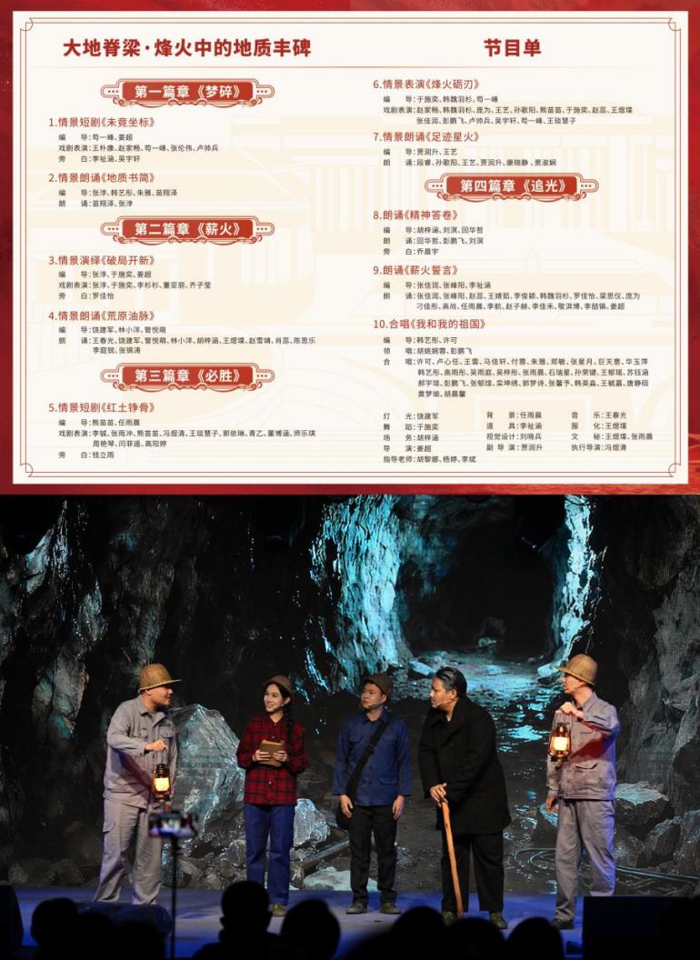 第三篇章 “必胜” 以军民协作开展 “地质战” 为主线,通过情景剧《红土铮骨》、舞蹈《烽火利刃》与情景朗诵《足迹星火》,呈现军民一心的伟大力量,彰显地质知识在战时的实用价值。