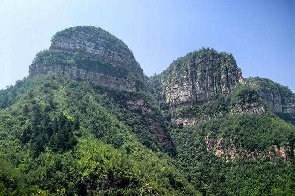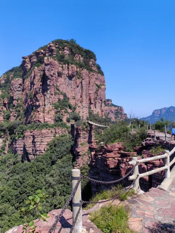 走至山顶,是一处巨大的平台,顶部整体平坦,张河湾水库在其西北方向下方,全貌几乎囊括,崖壁周边有部分松动,总体视野广阔,采光良好,风景优美。